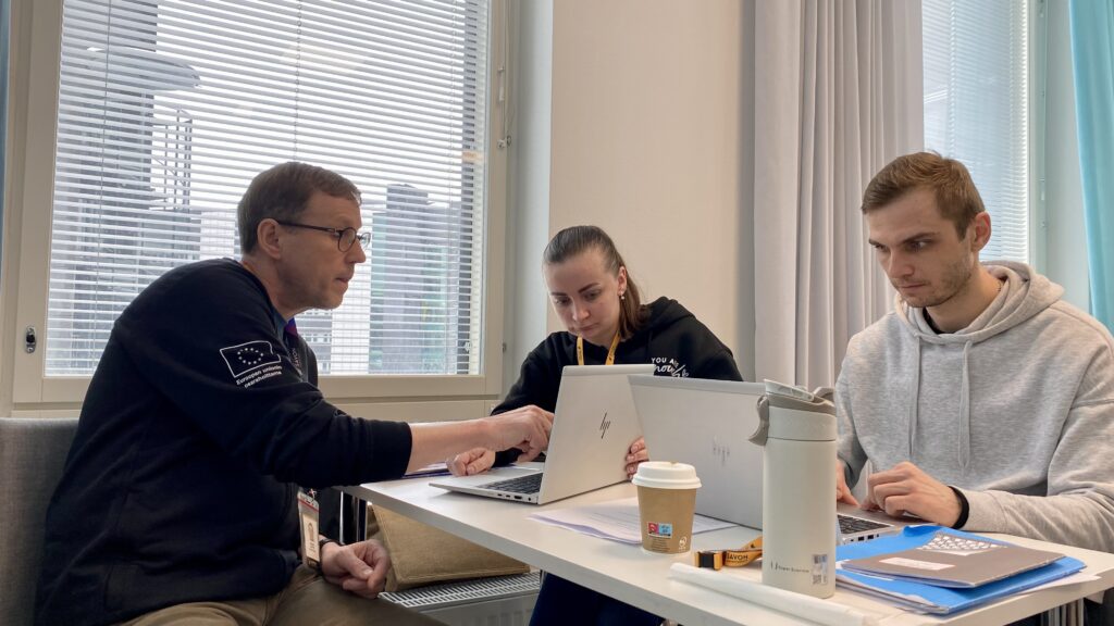 Kuva: Juhani Lantto neuvoo työnhakulomakkeen täyttämisessä Olena Rybachukia. Vieressä omaa lomakettaan täyttää Danylo Syvkov.